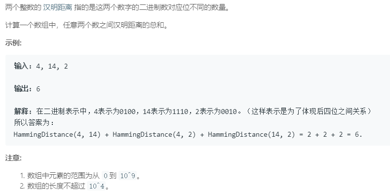 25.汉明距离总和 发表于 2019-02-11 更新于 2025-10-02 分类于 programming 题目 解析 以第k位为例 假设所有数字的第k位为:1 0 1 0 汉明距离与 0 1的个数有关 第k位汉明距离总和为 $num_0 * num_1$ 【其中】: 1. $num_0$:数字0的个数 2. $num_1$:数字1的个数代码123456789101112int totalHammingDistance(vector<int>& nums) { int res = 0; for(int i = 0; i < 31; i++) { int ones = 0; for(auto x : nums) { if(x >> i & 1) ones++; } res += ones * (nums.size() - ones); } return res;}