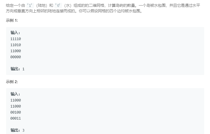 int numIslands(vector<vector<char>>& grid) { if(grid.empty() || grid[0].empty()) return 0; int res = 0; int m = grid.size(), n = grid[0].size(); for(int i = 0; i < m; i++) for(int j = 0; j < n; j++) if(grid[i][j] == '1') { res++; dfs(grid, i, j); }