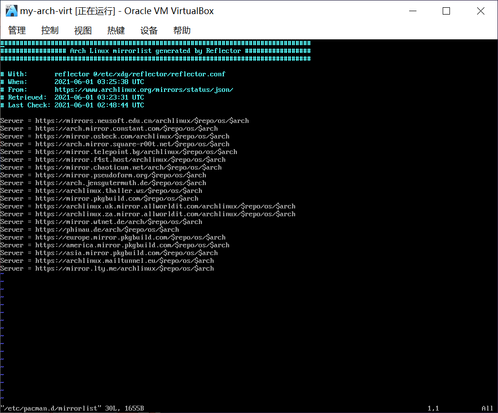 修改完成的 /etc/pacman.d/mirrorlist 文件如图所示。