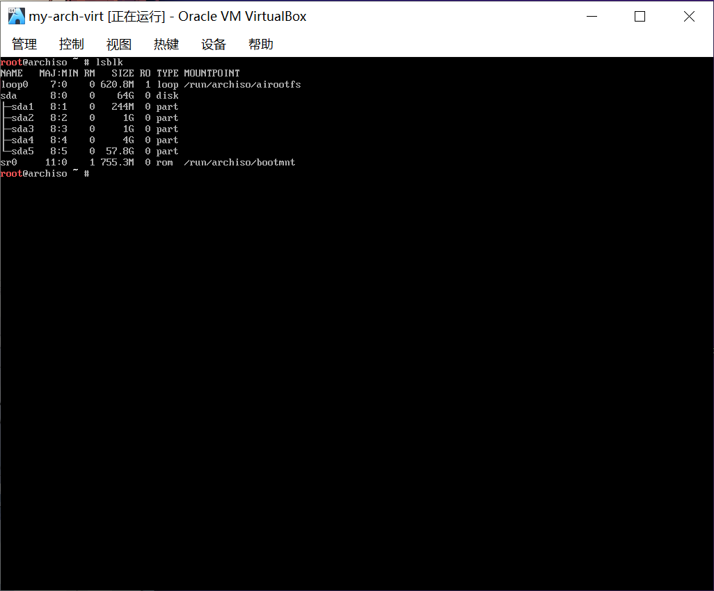 lsblk命令,区分要安装 archlinux 的磁盘(通过观察磁盘的大小、已存在的分区情况等判断)并显示当前磁盘的分区情况:1