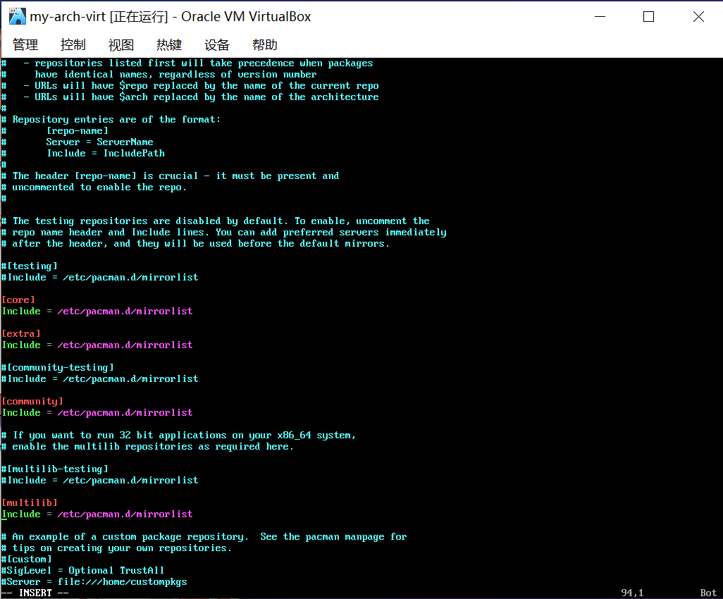 使用 vim 编辑器修改 /etc/pacman.d/mirrorlist 文件。将 pacman 软件仓库源更换为国内软件仓库镜像源:
