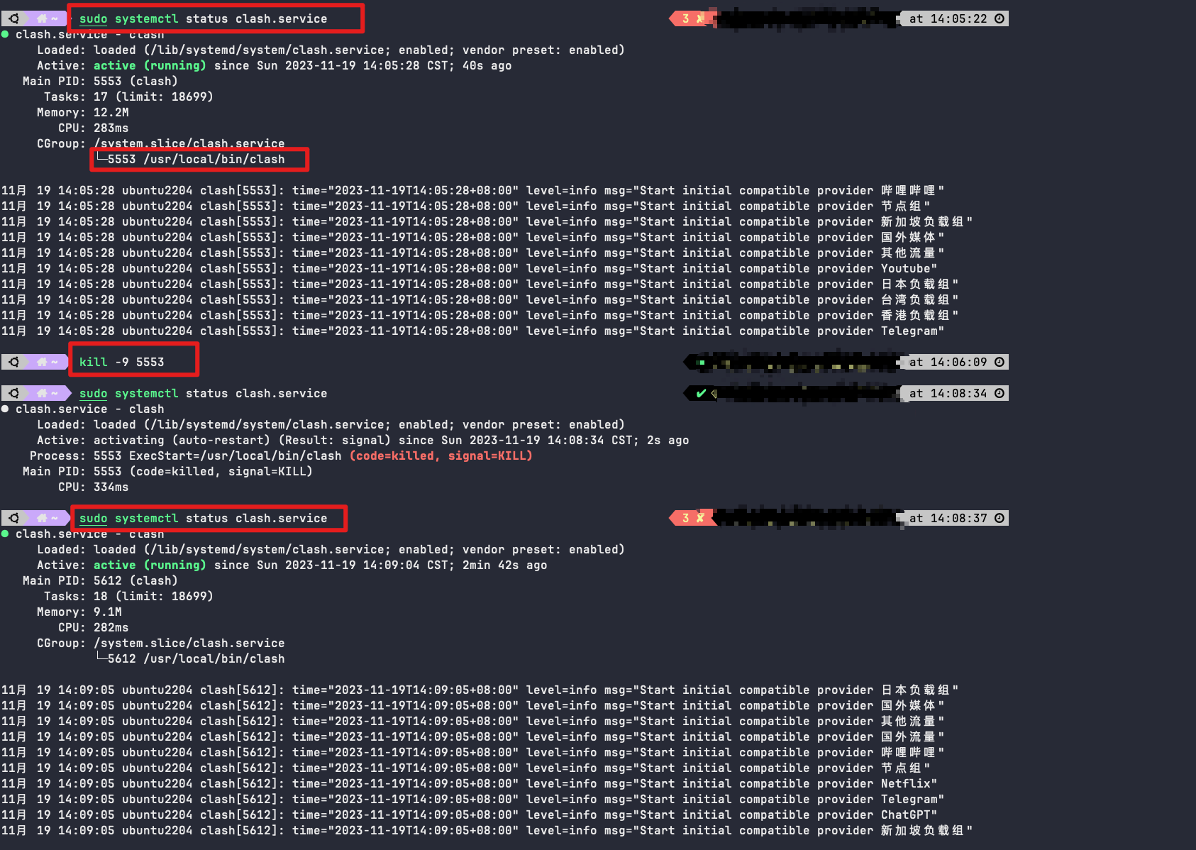 操作 命令 启动 sudo systemctl start clash.service停止 sudo systemctl stop clash.service查看状态 sudo systemctl status clash.service测试自动重启功能