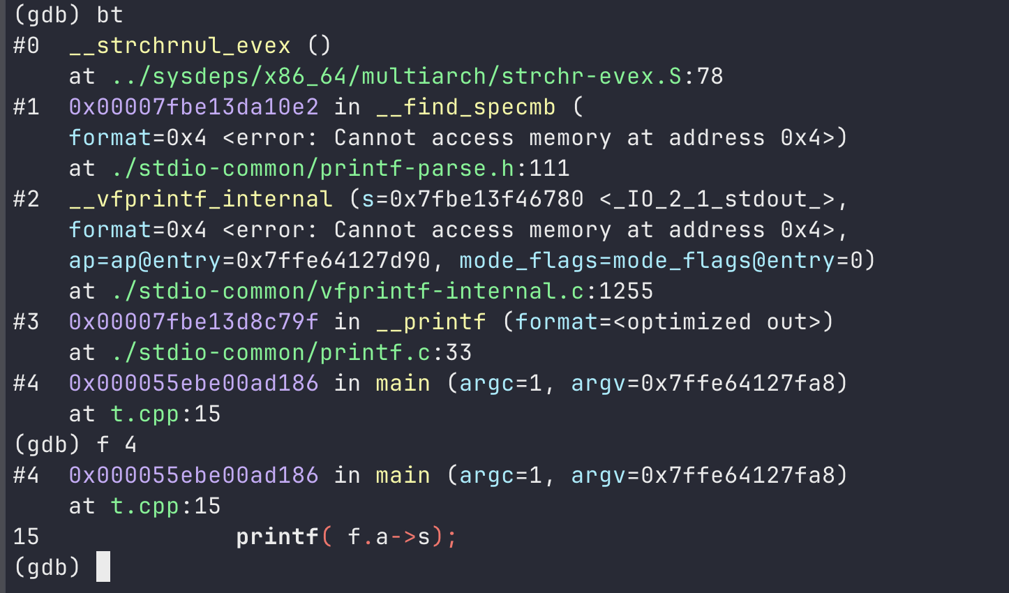 Breakpoint 1, main () at test_v2.cpp:13 13 int main() { (gdb) disassemble Dump of assembler code for function main(): 0x00005555555551a9 <+0>: endbr64 0x00005555555551ad <+4>: push %rbp 0x00005555555551ae <+5>: mov %rsp,%rbp 0x00005555555551b1 <+8>: sub $0x30,%rsp => 0x00005555555551b5 <+12>: mov %fs:0x28,%rax 0x00005555555551be <+21>: mov %rax,-0x8(%rbp) 0x00005555555551c2 <+25>: xor %eax,%eax 0x00005555555551c4 <+27>: lea -0x30(%rbp),%rax 0x00005555555551c8 <+31>: add $0x4,%rax 0x00005555555551cc <+35>: mov %rax,%rsi 0x00005555555551cf <+38>: lea 0xe2e(%rip),%rax # 0x555555556004 0x00005555555551d6 <+45>: mov %rax,%rdi 0x00005555555551d9 <+48>: mov $0x0,%eax 0x00005555555551de <+53>: call 0x555555555080 <printf@plt> 0x00005555555551e3 <+58>: lea -0x30(%rbp),%rax 0x00005555555551e7 <+62>: add $0x4,%rax 0x00005555555551eb <+66>: mov %rax,%rsi 0x00005555555551ee <+69>: lea 0xe16(%rip),%rax # 0x55555555600b 0x00005555555551f5 <+76>: mov %rax,%rdi 0x00005555555551f8 <+79>: mov $0x0,%eax 0x00005555555551fd <+84>: call 0x555555555080 <printf@plt> 0x0000555555555202 <+89>: lea -0x30(%rbp),%rax 0x0000555555555206 <+93>: add $0x4,%rax 0x000055555555520a <+97>: mov %rax,%rsi 0x000055555555520d <+100>: lea 0xe02(%rip),%rax # 0x555555556016 0x0000555555555214 <+107>: mov %rax,%rdi 0x0000555555555217 <+110>: mov $0x0,%eax 0x000055555555521c <+115>: call 0x555555555080 <printf@plt> 0x0000555555555221 <+120>: mov -0x20(%rbp),%rax 0x0000555555555225 <+124>: mov %rax,%rsi 0x0000555555555228 <+127>: lea 0xdf5(%rip),%rax # 0x555555556024 0x000055555555522f <+134>: mov %rax,%rdi 0x0000555555555232 <+137>: mov $0x0,%eax 0x0000555555555237 <+142>: call 0x555555555080 <printf@plt> 0x000055555555523c <+147>: lea -0x30(%rbp),%rax 0x0000555555555240 <+151>: add $0x4,%rax 0x0000555555555244 <+155>: mov %rax,-0x20(%rbp) 0x0000555555555248 <+159>: mov -0x20(%rbp),%rax 0x000055555555524c <+163>: mov %rax,%rsi 0x000055555555524f <+166>: lea 0xdce(%rip),%rax # 0x555555556024 0x0000555555555256 <+173>: mov %rax,%rdi 0x0000555555555259 <+176>: mov $0x0,%eax 0x000055555555525e <+181>: call 0x555555555080 <printf@plt> 0x0000555555555263 <+186>: mov $0x0,%eax 0x0000555555555268 <+191>: mov -0x8(%rbp),%rdx 0x000055555555526c <+195>: sub %fs:0x28,%rdx 0x0000555555555275 <+204>: je 0x55555555527c <main()+211> 0x0000555555555277 <+206>: call 0x5555555550a0 <__stack_chk_fail@plt> 0x000055555555527c <+211>: leave 0x000055555555527d <+212>: ret End of assembler dump. (gdb) l 1 1 #include <iostream> 2 #include <stdio.h> 3 4 using namespace std; 5 6 struct String { 7 int len; 8 char s[10]; 9 char *p; 10 int length; (gdb) 11 }; 12 13 int main() { 14 String st; 15 printf("s: %s\n", st.s); 16 printf("s ptr: %p\n", st.s); 17 printf("(&s) ptr: %p\n", &(st.s)); 18 printf("p: %s\n", st.p); 19 st.p = st.s; 20 printf("p: %s\n", st.p); (gdb) 21 return 0; 22 } 23 (gdb) diass Undefined command: "diass". Try "help". (gdb) disassemble Dump of assembler code for function main(): 0x00005555555551a9 <+0>: endbr64 0x00005555555551ad <+4>: push %rbp 0x00005555555551ae <+5>: mov %rsp,%rbp 0x00005555555551b1 <+8>: sub $0x30,%rsp => 0x00005555555551b5 <+12>: mov %fs:0x28,%rax 0x00005555555551be <+21>: mov %rax,-0x8(%rbp) 0x00005555555551c2 <+25>: xor %eax,%eax 0x00005555555551c4 <+27>: lea -0x30(%rbp),%rax 0x00005555555551c8 <+31>: add $0x4,%rax 0x00005555555551cc <+35>: mov %rax,%rsi 0x00005555555551cf <+38>: lea 0xe2e(%rip),%rax # 0x555555556004 0x00005555555551d6 <+45>: mov %rax,%rdi 0x00005555555551d9 <+48>: mov $0x0,%eax 0x00005555555551de <+53>: call 0x555555555080 <printf@plt> 0x00005555555551e3 <+58>: lea -0x30(%rbp),%rax 0x00005555555551e7 <+62>: add $0x4,%rax 0x00005555555551eb <+66>: mov %rax,%rsi 0x00005555555551ee <+69>: lea 0xe16(%rip),%rax # 0x55555555600b 0x00005555555551f5 <+76>: mov %rax,%rdi 0x00005555555551f8 <+79>: mov $0x0,%eax 0x00005555555551fd <+84>: call 0x555555555080 <printf@plt> 0x0000555555555202 <+89>: lea -0x30(%rbp),%rax 0x0000555555555206 <+93>: add $0x4,%rax 0x000055555555520a <+97>: mov %rax,%rsi 0x000055555555520d <+100>: lea 0xe02(%rip),%rax # 0x555555556016 0x0000555555555214 <+107>: mov %rax,%rdi 0x0000555555555217 <+110>: mov $0x0,%eax 0x000055555555521c <+115>: call 0x555555555080 <printf@plt> 0x0000555555555221 <+120>: mov -0x20(%rbp),%rax 0x0000555555555225 <+124>: mov %rax,%rsi 0x0000555555555228 <+127>: lea 0xdf5(%rip),%rax # 0x555555556024 0x000055555555522f <+134>: mov %rax,%rdi 0x0000555555555232 <+137>: mov $0x0,%eax 0x0000555555555237 <+142>: call 0x555555555080 <printf@plt> 0x000055555555523c <+147>: lea -0x30(%rbp),%rax 0x0000555555555240 <+151>: add $0x4,%rax 0x0000555555555244 <+155>: mov %rax,-0x20(%rbp) 0x0000555555555248 <+159>: mov -0x20(%rbp),%rax 0x000055555555524c <+163>: mov %rax,%rsi 0x000055555555524f <+166>: lea 0xdce(%rip),%rax # 0x555555556024 0x0000555555555256 <+173>: mov %rax,%rdi 0x0000555555555259 <+176>: mov $0x0,%eax 0x000055555555525e <+181>: call 0x555555555080 <printf@plt> 0x0000555555555263 <+186>: mov $0x0,%eax 0x0000555555555268 <+191>: mov -0x8(%rbp),%rdx 0x000055555555526c <+195>: sub %fs:0x28,%rdx 0x0000555555555275 <+204>: je 0x55555555527c <main()+211> 0x0000555555555277 <+206>: call 0x5555555550a0 <__stack_chk_fail@plt> 0x000055555555527c <+211>: leave 0x000055555555527d <+212>: ret End of assembler dump. (gdb) info line 15 Line 15 of "test_v2.cpp" starts at address 0x5555555551c4 <main()+27> and ends at 0x5555555551e3 <main()+58>. (gdb) ni 0x00005555555551be 13 int main() { (gdb) 0x00005555555551c2 13 int main() { (gdb) 15 printf("s: %s\n", st.s); (gdb) disassemble Dump of assembler code for function main(): 0x00005555555551a9 <+0>: endbr64 0x00005555555551ad <+4>: push %rbp 0x00005555555551ae <+5>: mov %rsp,%rbp 0x00005555555551b1 <+8>: sub $0x30,%rsp 0x00005555555551b5 <+12>: mov %fs:0x28,%rax 0x00005555555551be <+21>: mov %rax,-0x8(%rbp) 0x00005555555551c2 <+25>: xor %eax,%eax => 0x00005555555551c4 <+27>: lea -0x30(%rbp),%rax 0x00005555555551c8 <+31>: add $0x4,%ra