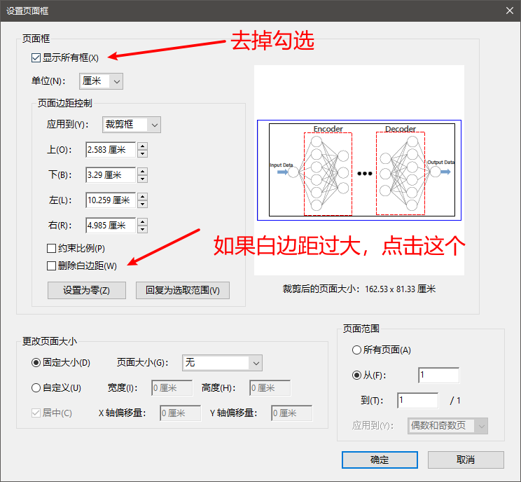 然后会出现如下的框,去掉勾选“显示所有框”(这一步是去掉黑边,有时会出现pdf在LaTeX里面有框的问题)然后如果内容的白边框太宽,可以点击“删除白边距”。