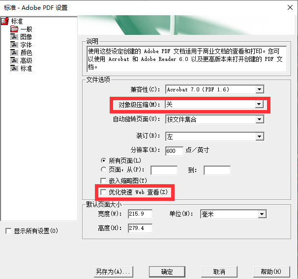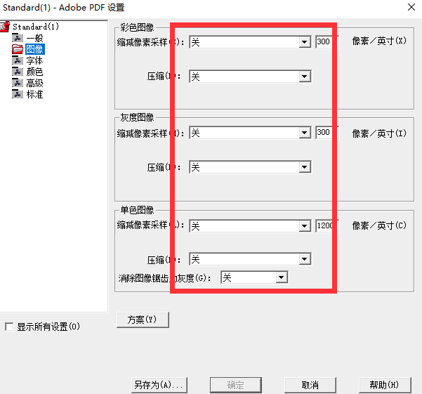可以设置分辨率为 2400 点/英寸图像,所有选项全部设置为关,确定后保存